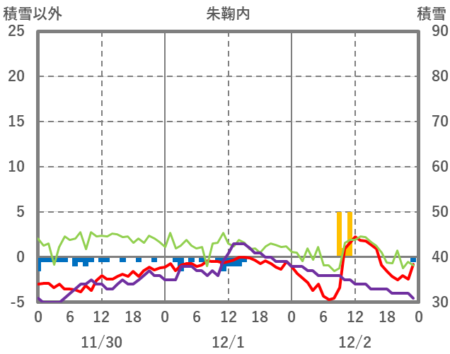 | 日 | 時 | 気温 | 降水 | 風向/風速 | 日照 | 積雪 | 降雪 |