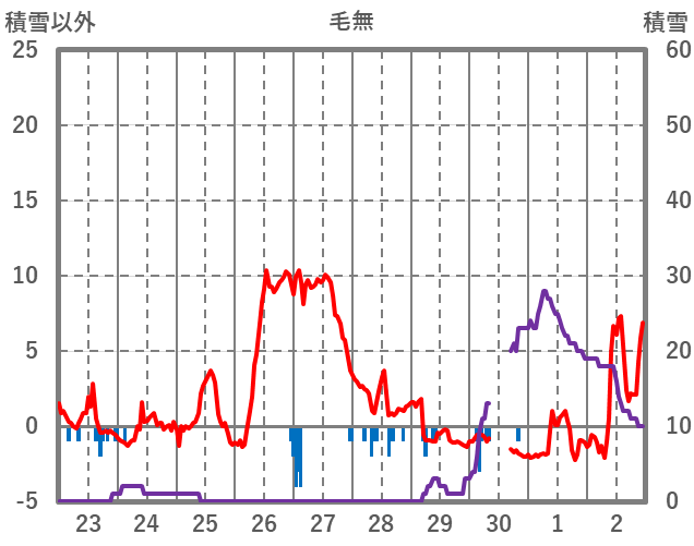 | 日 | 時 | 気温 | 降水 | 風向/風速 | 日照 | 積雪 | 降雪 |