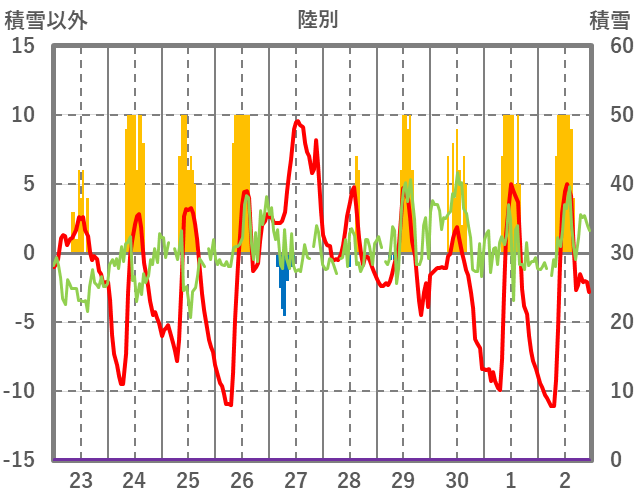 | 日 | 時 | 気温 | 降水 | 風向/風速 | 日照 | 積雪 | 降雪 |