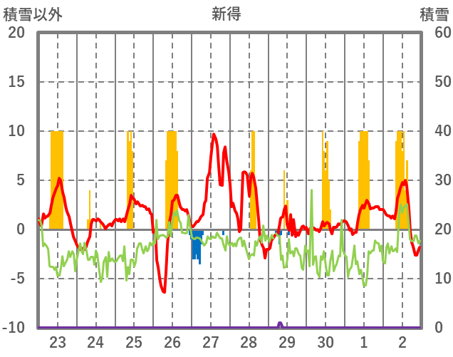 | 日 | 時 | 気温 | 降水 | 風向/風速 | 日照 | 積雪 | 降雪 |