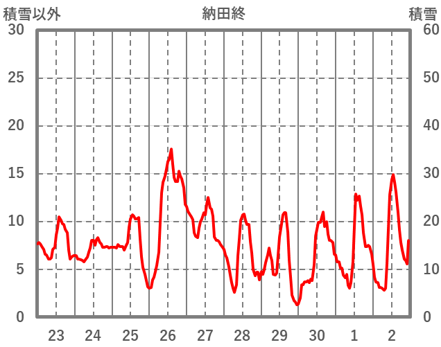 | 日 | 時 | 気温 | 降水 | 風向/風速 | 日照 | 積雪 | 降雪 |