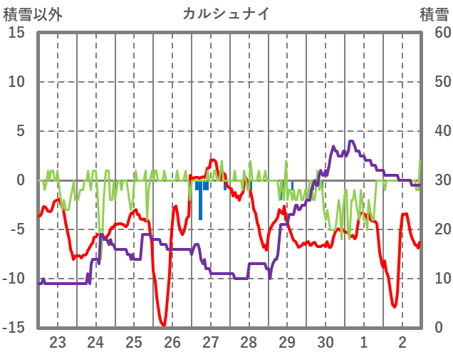 | 日 | 時 | 気温 | 降水 | 風向/風速 | 日照 | 積雪 | 降雪 |