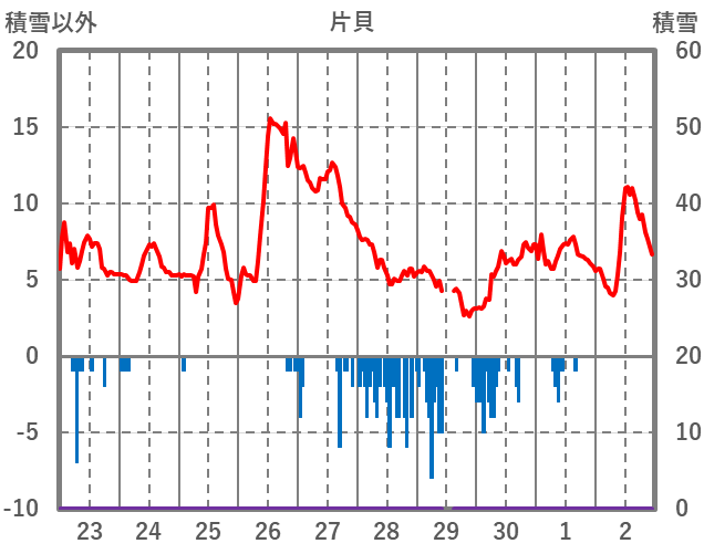 | 日 | 時 | 気温 | 降水 | 風向/風速 | 日照 | 積雪 | 降雪 |
