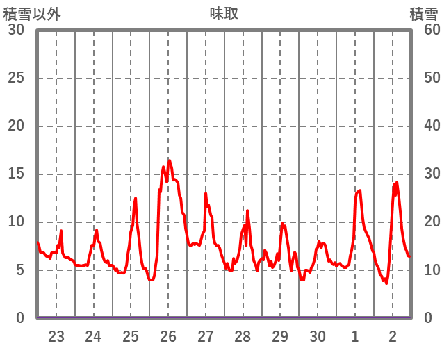 | 日 | 時 | 気温 | 降水 | 風向/風速 | 日照 | 積雪 | 降雪 |