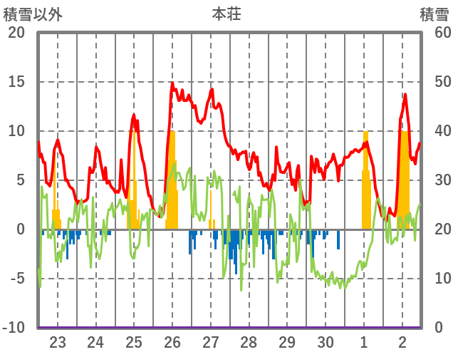 | 日 | 時 | 気温 | 降水 | 風向/風速 | 日照 | 積雪 | 降雪 |