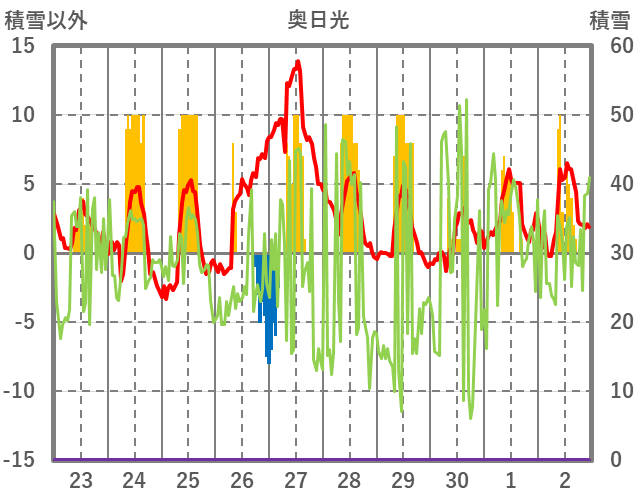 | 日 | 時 | 気温 | 降水 | 風向/風速 | 日照 | 積雪 | 降雪 |