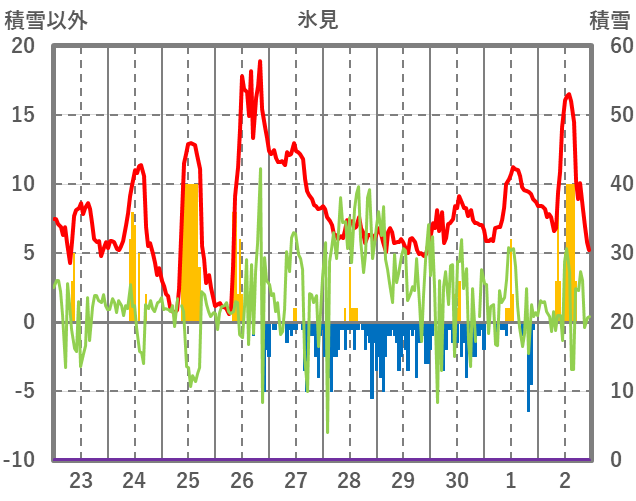 | 日 | 時 | 気温 | 降水 | 風向/風速 | 日照 | 積雪 | 降雪 |