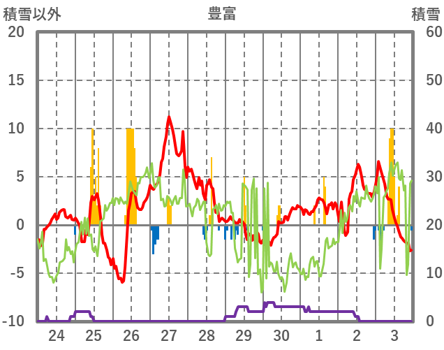 | 日 | 時 | 気温 | 降水 | 風向/風速 | 日照 | 積雪 | 降雪 |