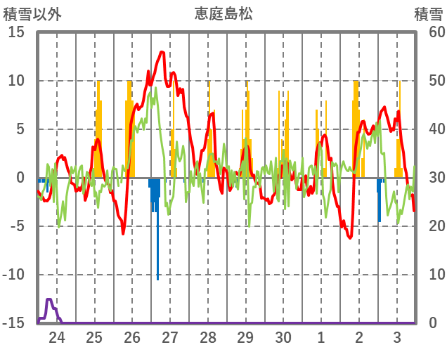 | 日 | 時 | 気温 | 降水 | 風向/風速 | 日照 | 積雪 | 降雪 |