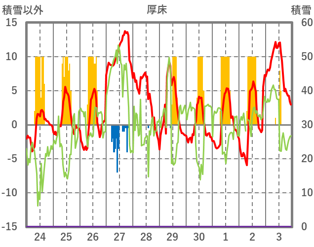| 日 | 時 | 気温 | 降水 | 風向/風速 | 日照 | 積雪 | 降雪 |