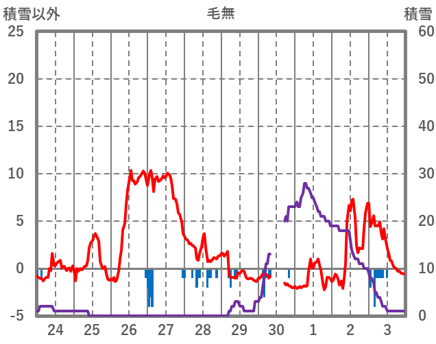 | 日 | 時 | 気温 | 降水 | 風向/風速 | 日照 | 積雪 | 降雪 |