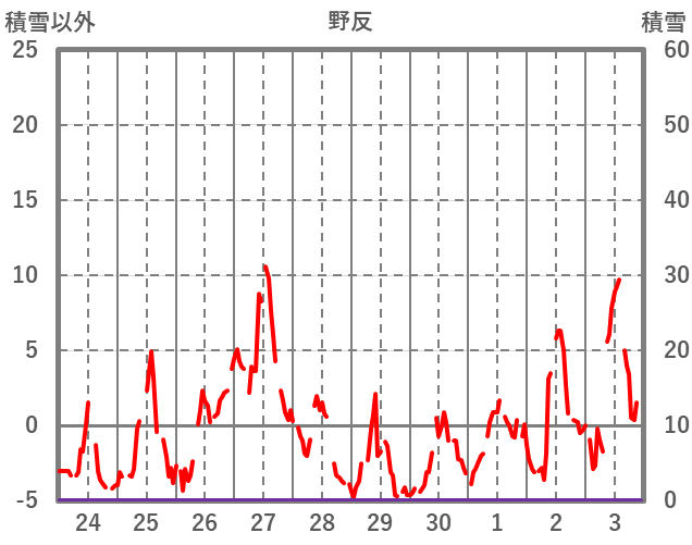 | 日 | 時 | 気温 | 降水 | 風向/風速 | 日照 | 積雪 | 降雪 |