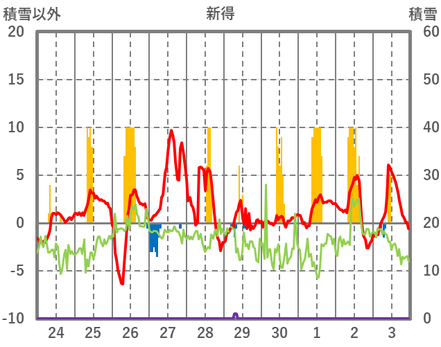 | 日 | 時 | 気温 | 降水 | 風向/風速 | 日照 | 積雪 | 降雪 |