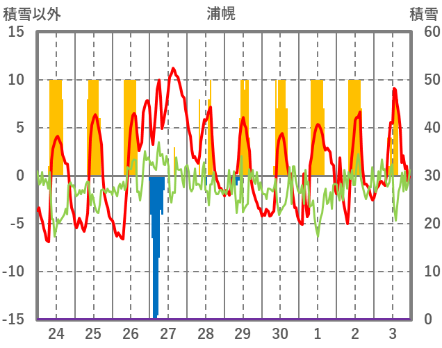 | 日 | 時 | 気温 | 降水 | 風向/風速 | 日照 | 積雪 | 降雪 |