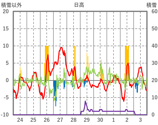 | 日 | 時 | 気温 | 降水 | 風向/風速 | 日照 | 積雪 | 降雪 |