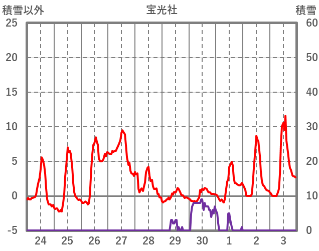| 日 | 時 | 気温 | 降水 | 風向/風速 | 日照 | 積雪 | 降雪 |