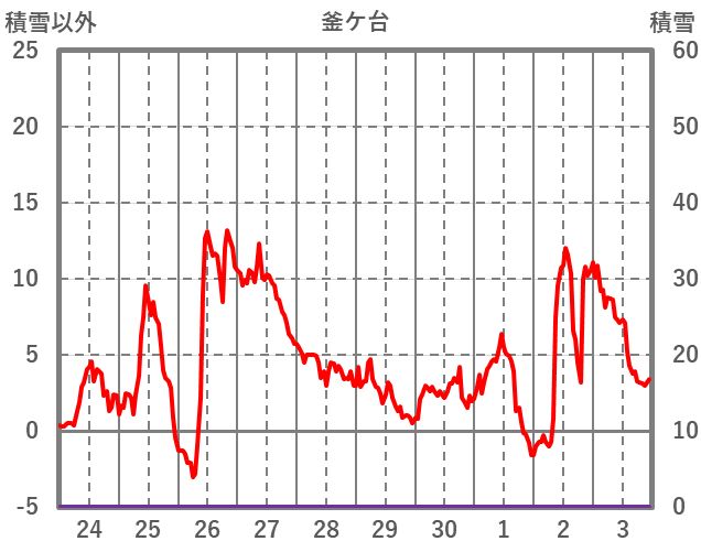 | 日 | 時 | 気温 | 降水 | 風向/風速 | 日照 | 積雪 | 降雪 |