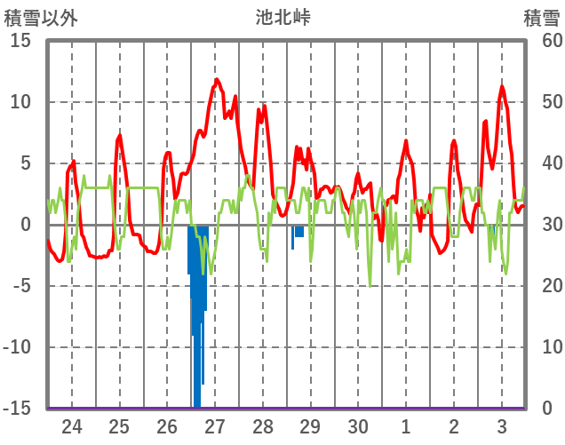 | 日 | 時 | 気温 | 降水 | 風向/風速 | 日照 | 積雪 | 降雪 |