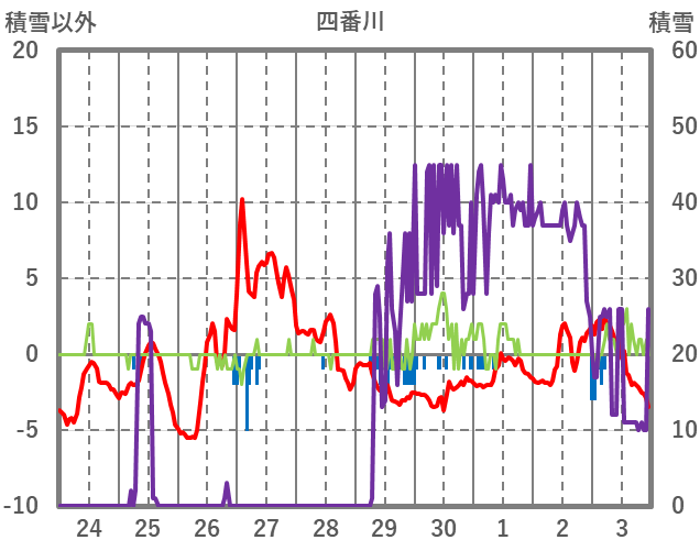 | 日 | 時 | 気温 | 降水 | 風向/風速 | 日照 | 積雪 | 降雪 |