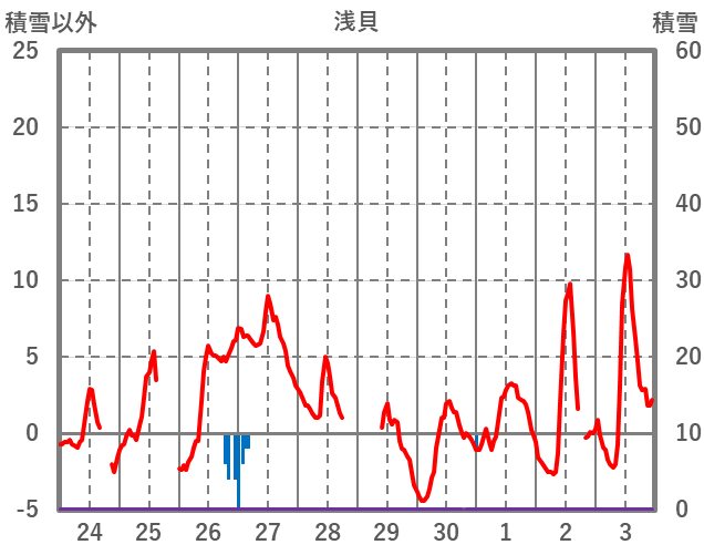 | 日 | 時 | 気温 | 降水 | 風向/風速 | 日照 | 積雪 | 降雪 |