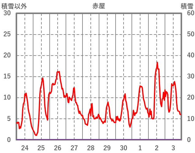 | 日 | 時 | 気温 | 降水 | 風向/風速 | 日照 | 積雪 | 降雪 |
