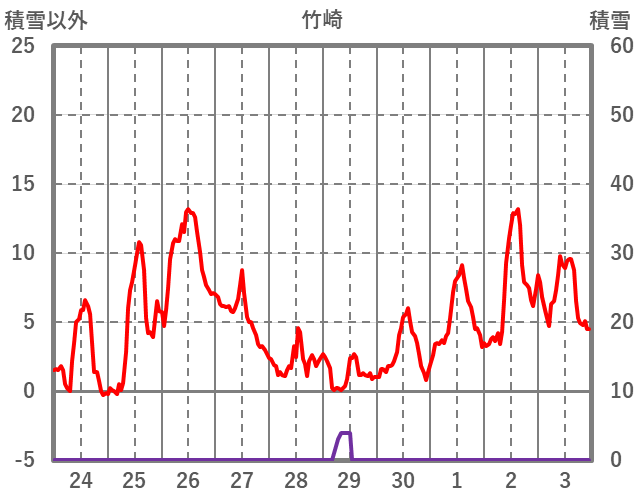 | 日 | 時 | 気温 | 降水 | 風向/風速 | 日照 | 積雪 | 降雪 |