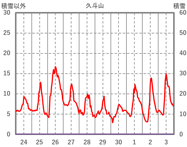 | 日 | 時 | 気温 | 降水 | 風向/風速 | 日照 | 積雪 | 降雪 |