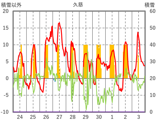 | 日 | 時 | 気温 | 降水 | 風向/風速 | 日照 | 積雪 | 降雪 |