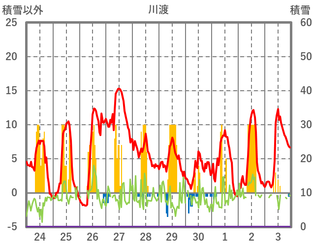 | 日 | 時 | 気温 | 降水 | 風向/風速 | 日照 | 積雪 | 降雪 |