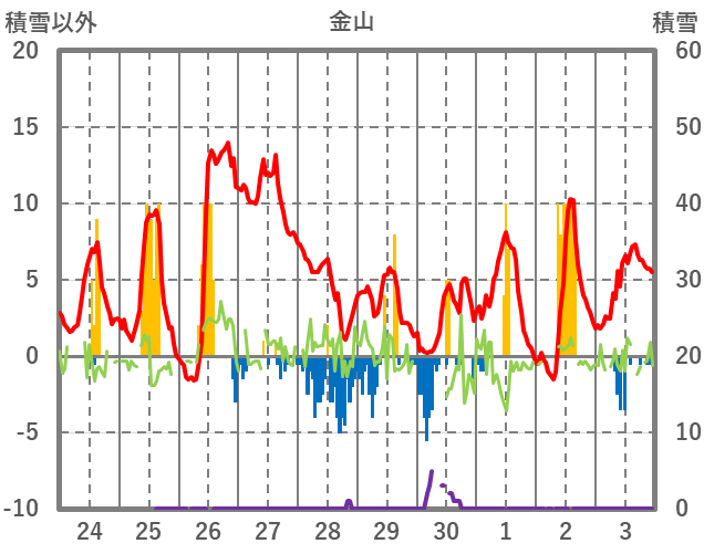 | 日 | 時 | 気温 | 降水 | 風向/風速 | 日照 | 積雪 | 降雪 |