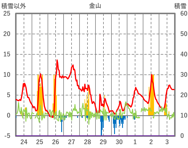 | 日 | 時 | 気温 | 降水 | 風向/風速 | 日照 | 積雪 | 降雪 |