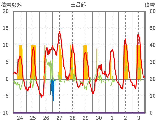| 日 | 時 | 気温 | 降水 | 風向/風速 | 日照 | 積雪 | 降雪 |