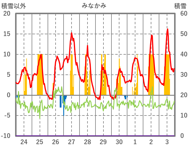 | 日 | 時 | 気温 | 降水 | 風向/風速 | 日照 | 積雪 | 降雪 |