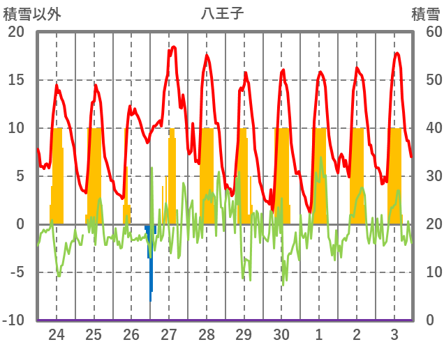 | 日 | 時 | 気温 | 降水 | 風向/風速 | 日照 | 積雪 | 降雪 |