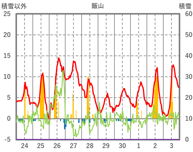 | 日 | 時 | 気温 | 降水 | 風向/風速 | 日照 | 積雪 | 降雪 |