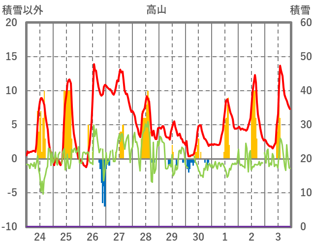 | 日 | 時 | 気温 | 降水 | 風向/風速 | 日照 | 積雪 | 降雪 |