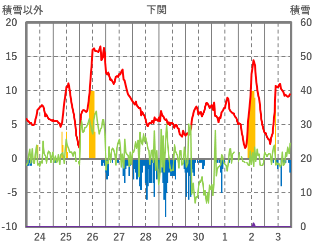 | 日 | 時 | 気温 | 降水 | 風向/風速 | 日照 | 積雪 | 降雪 |