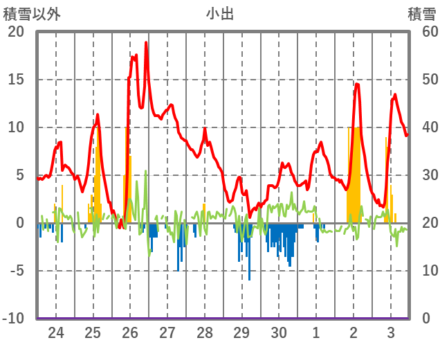 | 日 | 時 | 気温 | 降水 | 風向/風速 | 日照 | 積雪 | 降雪 |