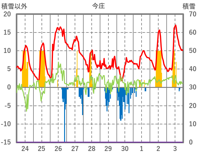 | 日 | 時 | 気温 | 降水 | 風向/風速 | 日照 | 積雪 | 降雪 |