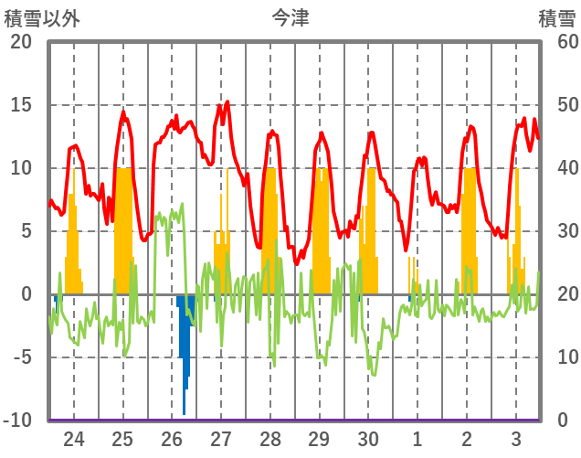 | 日 | 時 | 気温 | 降水 | 風向/風速 | 日照 | 積雪 | 降雪 |