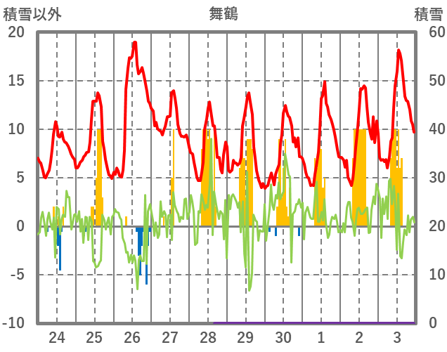 | 日 | 時 | 気温 | 降水 | 風向/風速 | 日照 | 積雪 | 降雪 |