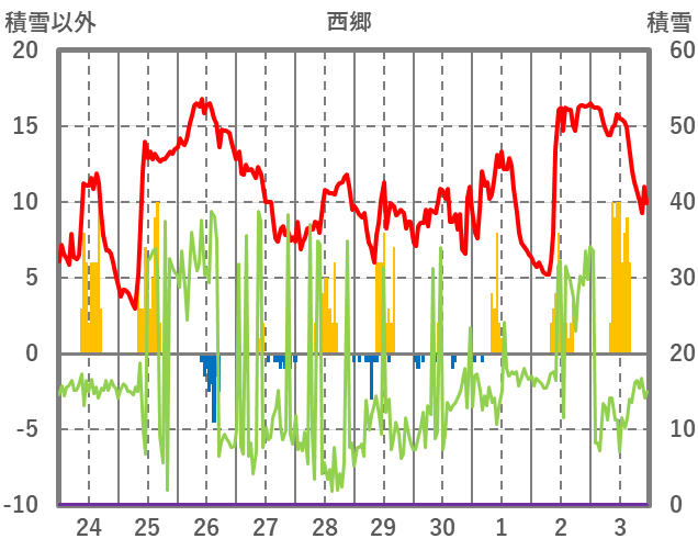 | 日 | 時 | 気温 | 降水 | 風向/風速 | 日照 | 積雪 | 降雪 |
