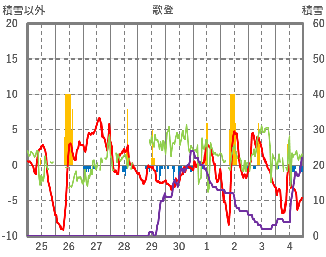 | 日 | 時 | 気温 | 降水 | 風向/風速 | 日照 | 積雪 | 降雪 |