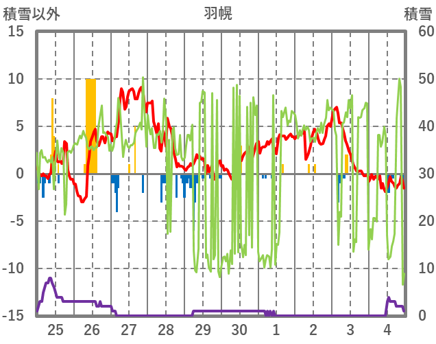 | 日 | 時 | 気温 | 降水 | 風向/風速 | 日照 | 積雪 | 降雪 |