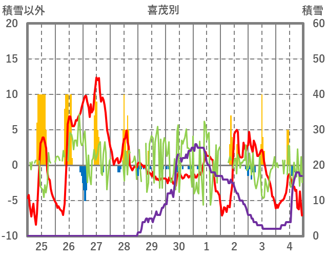 | 日 | 時 | 気温 | 降水 | 風向/風速 | 日照 | 積雪 | 降雪 |