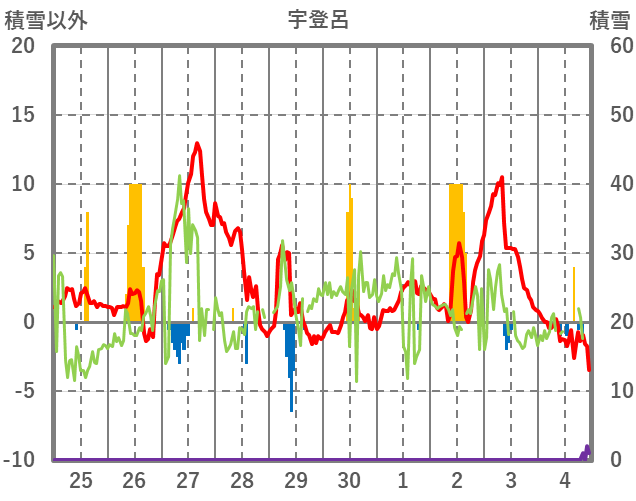| 日 | 時 | 気温 | 降水 | 風向/風速 | 日照 | 積雪 | 降雪 |