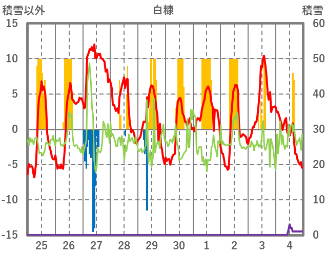 | 日 | 時 | 気温 | 降水 | 風向/風速 | 日照 | 積雪 | 降雪 |