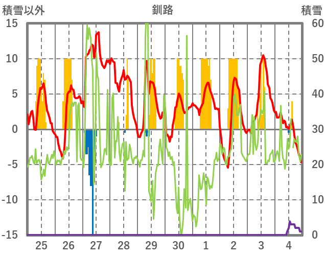 | 日 | 時 | 気温 | 降水 | 風向/風速 | 日照 | 積雪 | 降雪 |