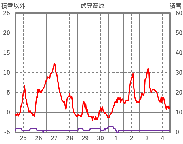 | 日 | 時 | 気温 | 降水 | 風向/風速 | 日照 | 積雪 | 降雪 |