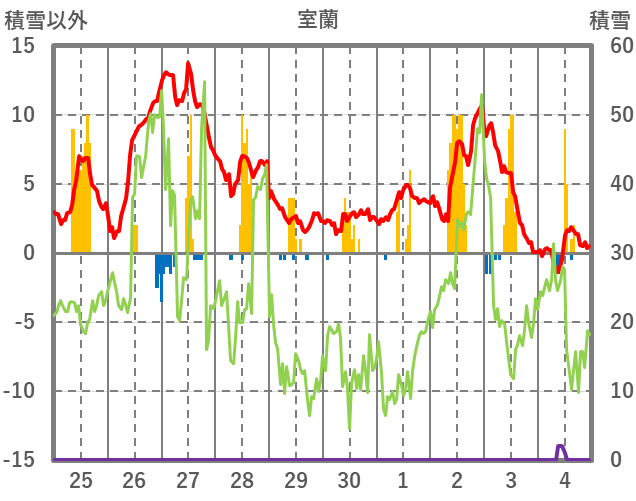 | 日 | 時 | 気温 | 降水 | 風向/風速 | 日照 | 積雪 | 降雪 |